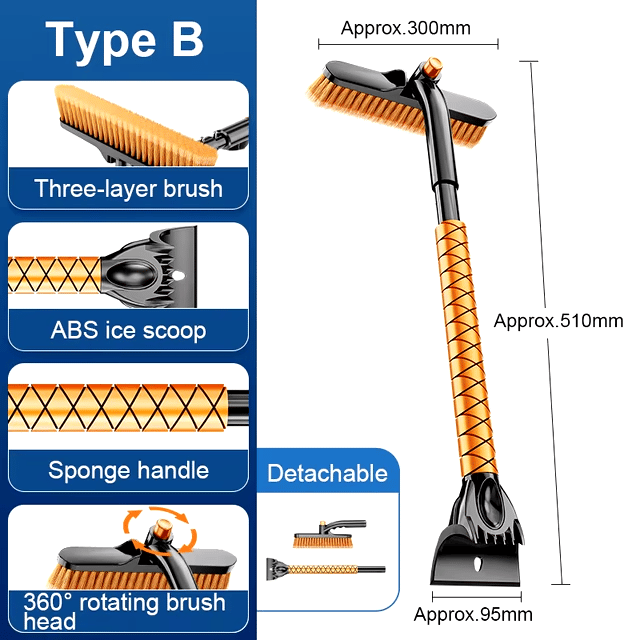 🌀 Dual-Function Design: One end features a brush, while the reversible shovel has a toothed ice scraper on the back, allowing for easy crushing of thick ice without scratching your car's paint.